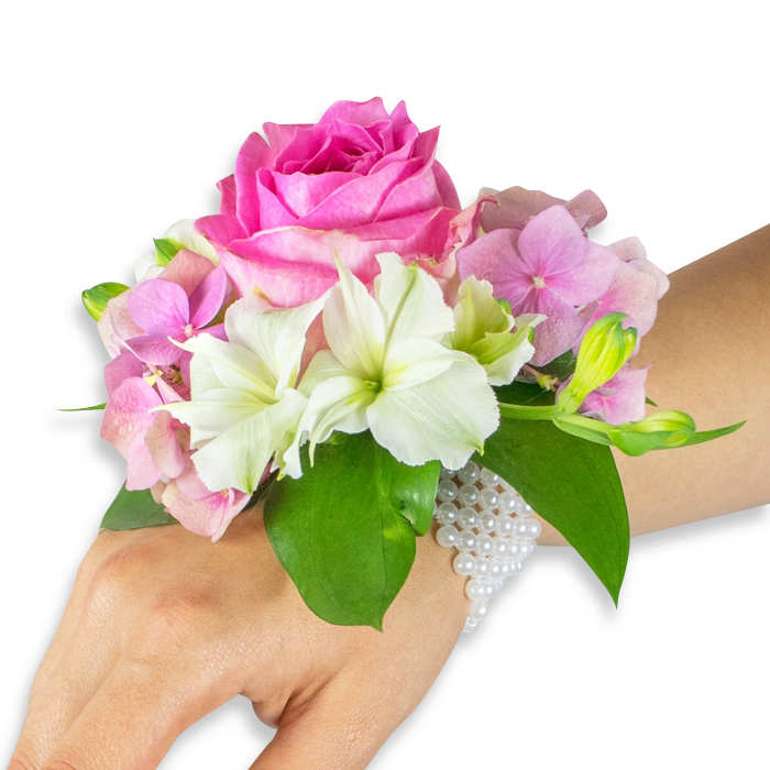 For a sweet and graceful look, the Pretty in Pink rose corsage adds a fresh look to an exquisite dress. This splendid floral piece made up of pink rose, and hydrengea with a dash of white alstroemeria will add color to your special chosen guests of honor.